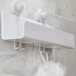 This large shower shelf takes the hassle out of shower storage by holding soap bars, shower gels and shampoo bottles and features hooks for razors, sponges and flannels and a hinged, removable, shatter-resistant acrylic mirror.