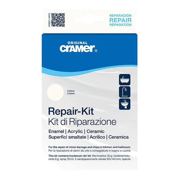 For long-lasting repairs of impact damage and flaking on washbasins, kitchen sinks, shower trays and bath tubs with enamel, ceramic (porcelain) and acrylic surfaces. The Cramer Bath Repair kit contains filling compound, hardener, spatula, repair spray and sandpaper for the repair of enamel, acrylic and ceramic surfaces.
