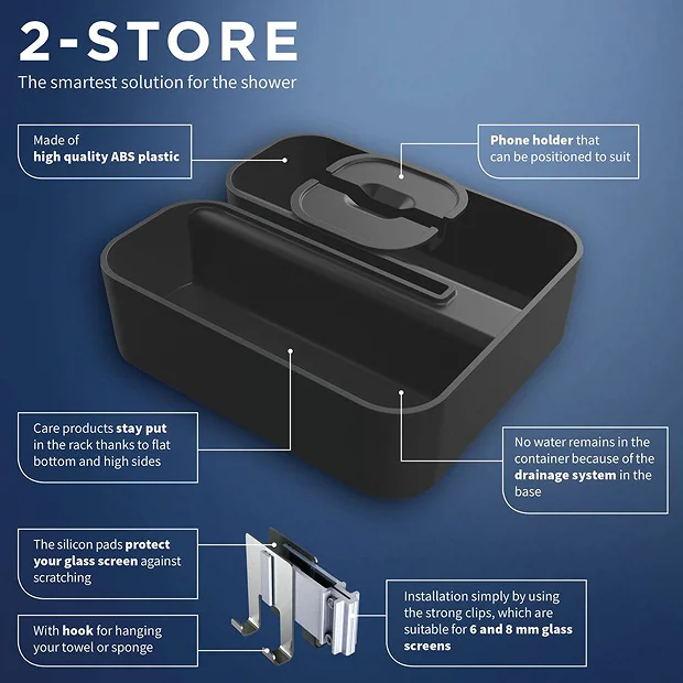 Create more space behind your shower screen with the Tiger 2-Store Clip-on Shower Basket. This product offers elements of character with smart and stylish storage solutions. This way you can easily clamp the basket to the glass screen, the hooks can be placed flexibly and the set is equipped with a universal phone holder. You can also enjoy your favorite music while taking a shower.